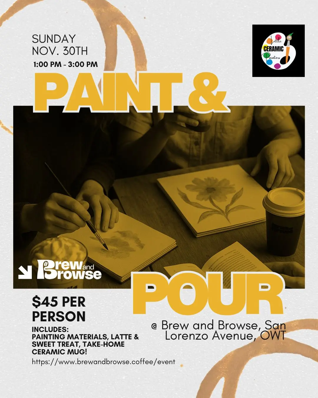 Join us at Brew & Browse on Sunday, November 30th, 2025, for a relaxing and creative Paint & Pour experience led by Little Ceramic Painters. From 1:00 PM to 3:00 PM, our cozy café transforms into a mini art studio where you can sip, paint, and unwind with friends, family, or a special someone.